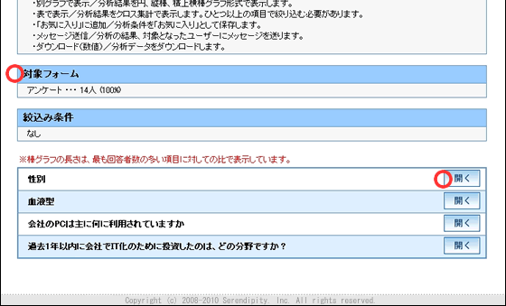 フォームの各項目が表示されます。見たい項目について「開く」ボタンをクリックします